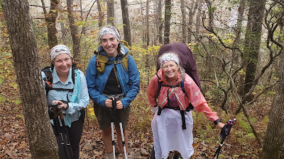 The store opened early and gave the backpackers free coffee!! We were off at 9 am with an "easier" day of 11 miles with no significant climbs, but lots of rolling hills. The weather was overcast and we tried to outrun the rain, but with no luck. The rain started during the descent of Cowrock Mountain. Thankfully the rain was a steady trickle rather than a downpour, but the slippery trail conditions made us hike slowly. The fog made the views non-existent, but we still had fun.