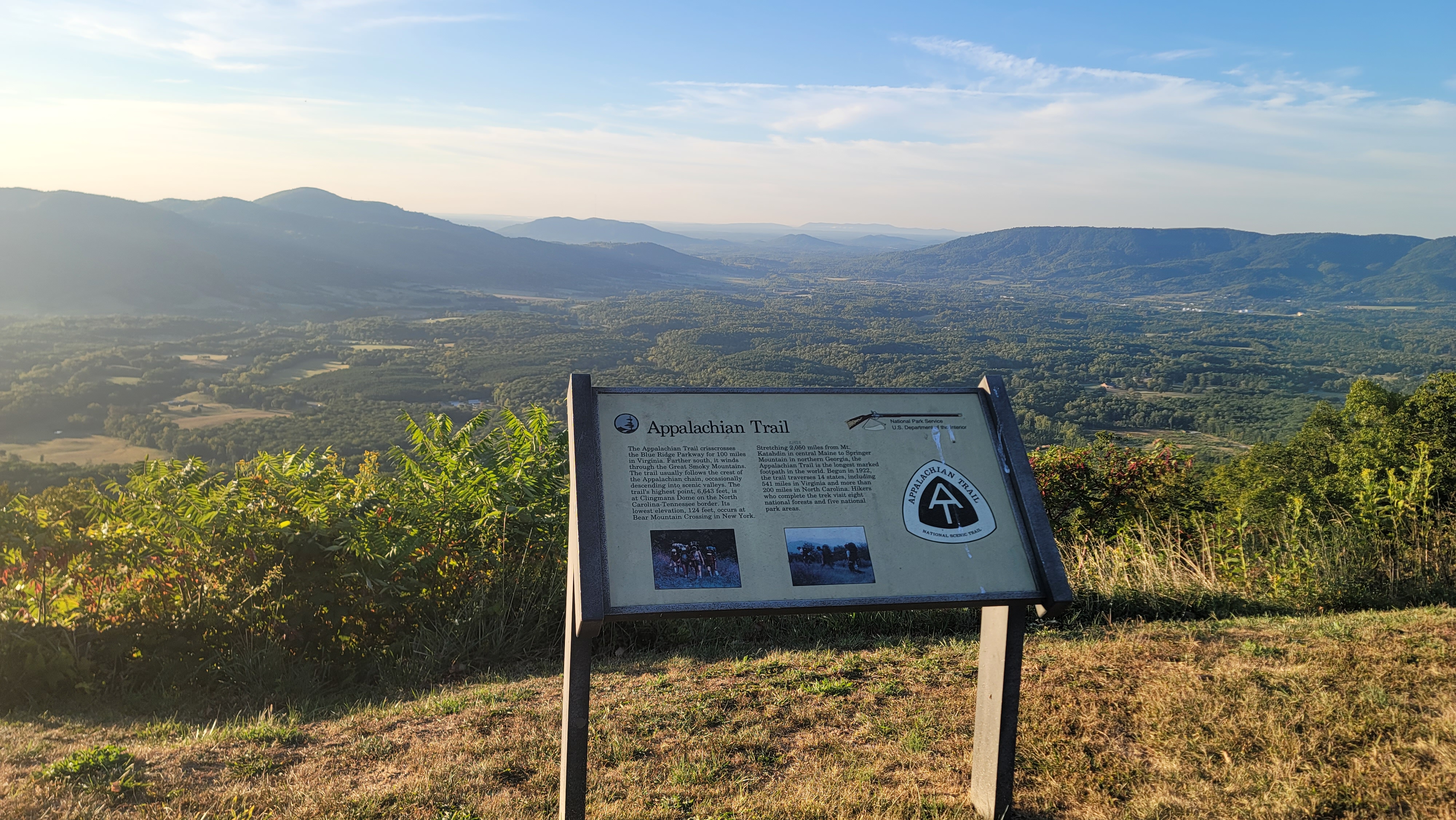 A short walk and I emerge onto the Blue Ridge Parkway and see a pull-off offering a view of the sunrise immediately in front of me! I take off my pack and plan on watching the sunrise, when I realize the sun is rising behind the trees to my left. So I heft my pack and head up the trail.